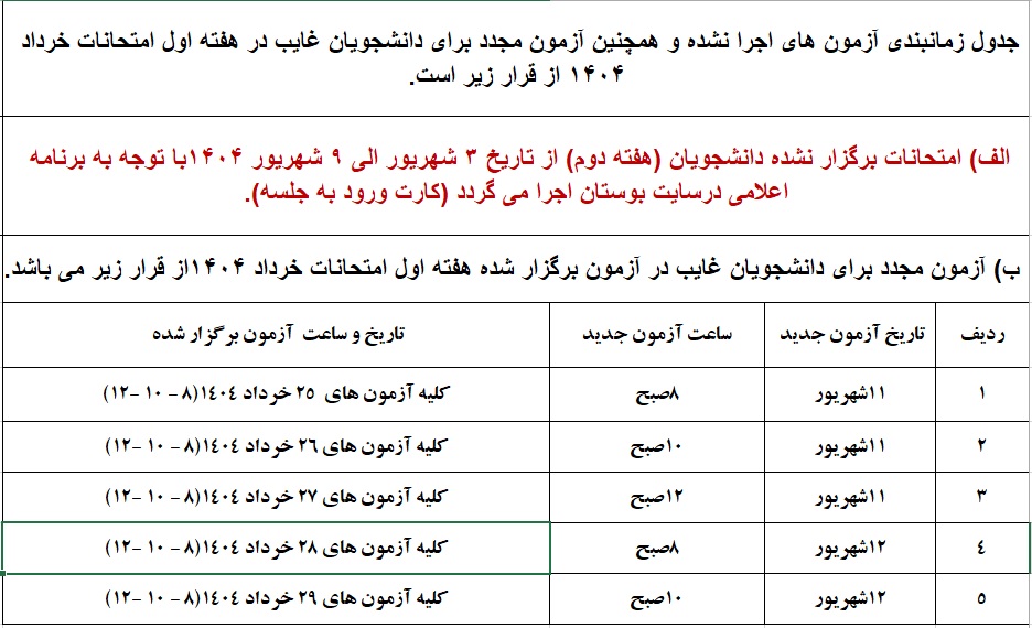 جدول زمانبندی آزمون های اجرا نشده و همچنین آزمون مجدد برای دانشجویان غایب در هفته اول امتحانات خرداد 1404 از قرار زیر است.